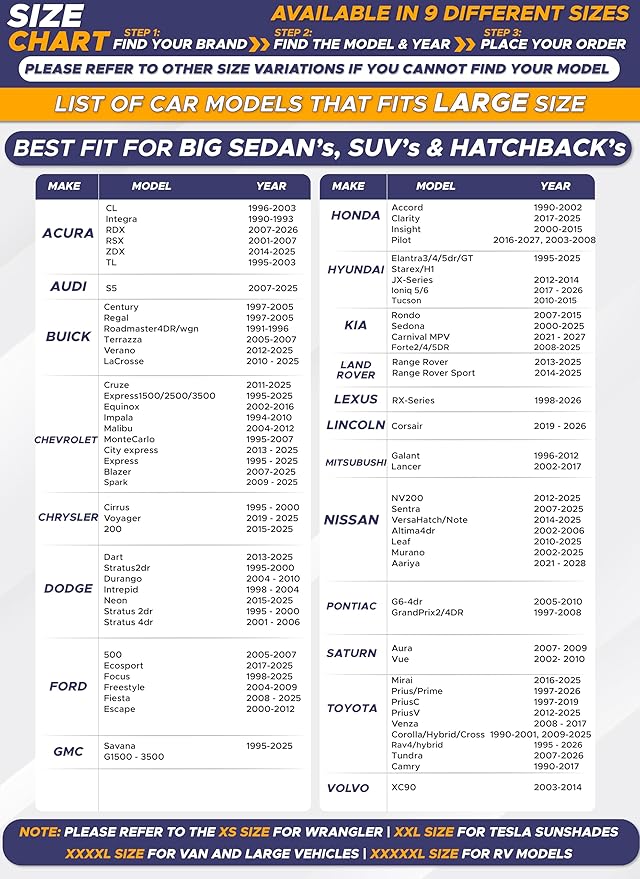 - Wide Range of Sizes: EcoNour’s car sun shade windshield comes in seven different sizes to suit small sedans, SUVs, and family-sized vehicles. Use our size chart to find the perfect car window shade for your vehicle.