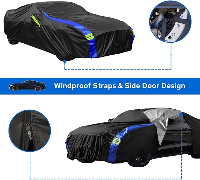 - 【 High-Quality Material】- Car cover waterproof all weather is made of high-quality and safe fabrics. The streamlined design and superior craftsmanship provide high-quality lasting protection for our products. Car covers for automobiles are engineered to be durable, colorfast, UV resistant, and water resistant to keep your car dry and warm in all seasons, for outdoor and indoor protection.