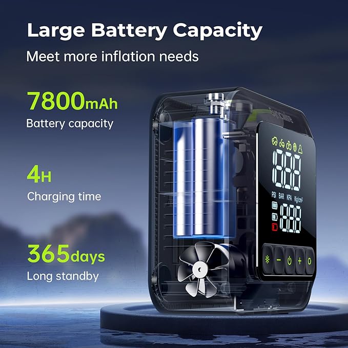 - 【Super-Fast Inflator with Extreme Precision】The Syncwire tire inflator portable air compressor inflates up to 3 times faster than similar competitors. With a rated pressure of up to 150 PSI and a 7800mAh battery, it offers strong airflow and quick speed, making it ideal for inflating car tires, bikes, motorcycles, balls, and more. Inflate a 26.3” tire (28-33 PSI) in just 56 seconds with pinpoint precision of ±0.5 PSI. NOTE: Not suitable for large-volume uses like air mattresses or paddle boards.