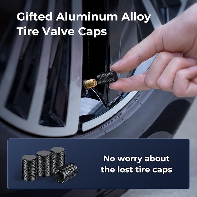 - 【Gifted Car Tire Valve Caps】- Syncwire air pump comes with a comprehensive set of accessories, including multiple inflation nozzles for various demands. Additionally, we provide a unique bonus of four high-quality aluminum alloy car tire valve caps, which are special and unique in the market. Should you ever misplace the original caps for your vehicle's tires, these supplied tire valve caps serve as an excellent substitute, sparing you the embarrassment of lost valve caps.