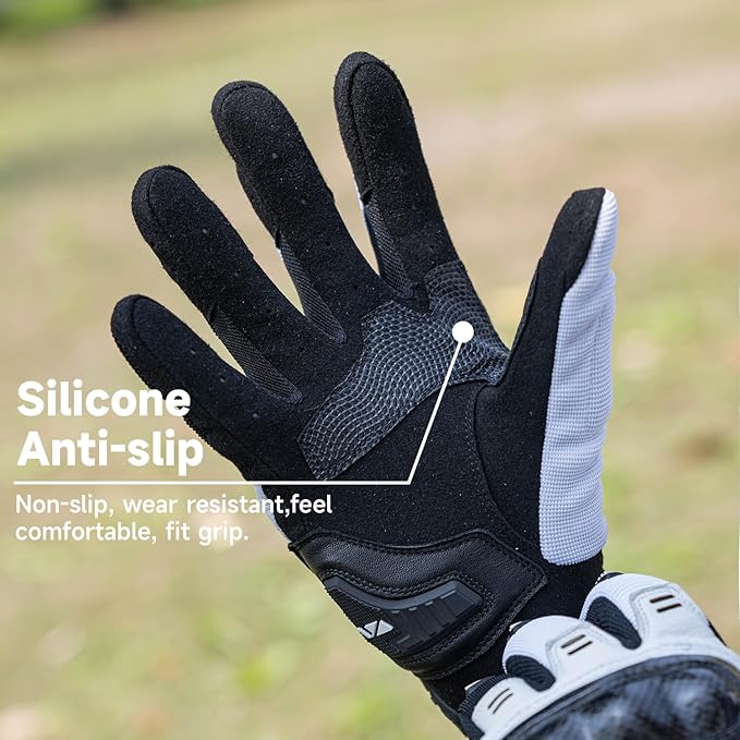 - Ultimate Safety and Comfort - VXW high protection motorcycle golves for man is made of soft and breathable suede and leather with air hole, full-body ergonomic design, super easy to take on and off. The gloves joints are equipped with ultra-hard carbon fiber protection and TPR protection to protect your knuckle, the palm of the gloves is designed with the silicone anti-slip increasing the friction when gripping.