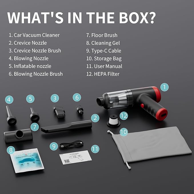 - Included Components : Portable Vacuum, Car cleaning Gel, Floor Nozzle, Long Suction Nozzle, Suction Brush, Long Blowing Nozzle, Blowing Brush, Fine Steel Filter, HEPA Filter*2, Storage Bag, Type-C Cable, Manual. This car vacuum portable cordless features an exquisite compact packaging design, which lets you pack all the part in one bag case, making it an ideal gift for family, friends, or car enthusiasts. Don't hesitate to surprise your loved one! Portable Vacuum, Car cleaning Gel, Floor Nozzle, Long Suction Nozzle, Suction Brush, Long Blowing Nozzle, Blowing Brush, Fine Steel Filter, HEPA Filter*2, Storage B… See more