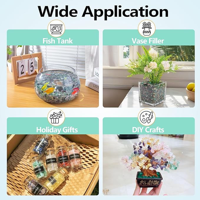 - Feature: Green crushed crystal is 5-7mm (0.2"-0.27"), 0.5 Lb/Box. Green agate chips are made from high-quality natural blue agate crystals, carefully processed into irregular shapes to create a unique and eye-catching look. (Please clean agate before use to bring out the dazzling color of the stone)