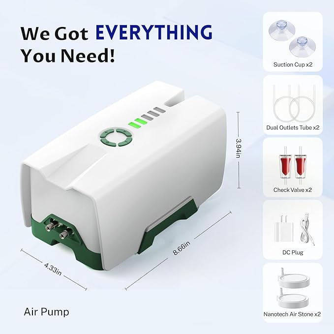 - 【Powerful & Steady Dual Outlets】Power: 4W(8000mAh), 6W(12000mAh), Max pressure: 20kPa. This aquarium air pump is equipped with STAINLESS STEEL outputs, perfect for 20-600 gallons large fish tanks and big marine aquariums. It outputs MORE air volume with LOWER energy cost.