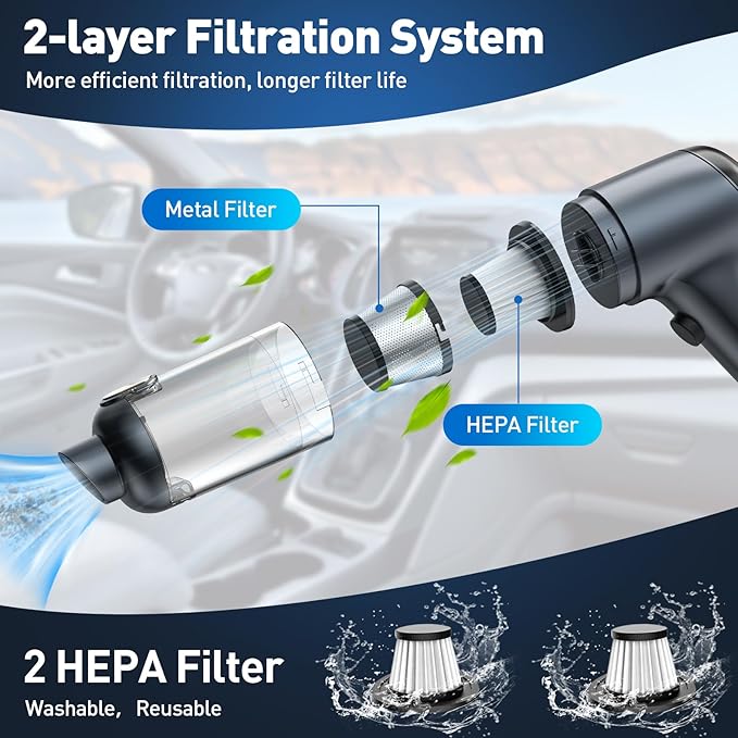- Dual-layer Filtration System: Handheld vacuum cleaner has a dual-layer filtration system, the front steel filter can prevent larger mess and debris, and the paper HEPA filter inside can prevent finer dust and particles, more efficient dual-layer filtration can extend the life of the motor. The steel and HEPA filters are washable and durable, and the extra HEPA filter can be used as a replacement. Note: If you find that the suction becomes weak, please wash the filter in time, the filter needs to be dried and then used!